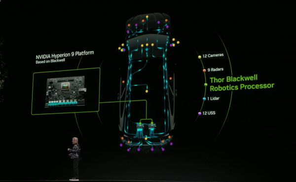 DRIVE Hyperion是首个端到端自动驾驶平台,搭载基于NVIDIA Blackwell架构构建的高性能系统级芯片DRIVE AGX Thor、NVIDIA DriveOS汽车操作系统、传感器套件以及主动安全和L2+驾驶堆栈,专为下一代车辆设计。图片来源:NVIDIA
